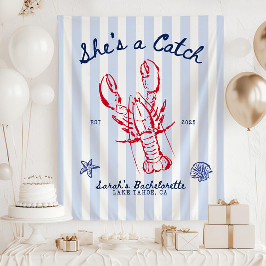 She's a Catch Bachelorette Banner Custom Lobster Theme Bachelorette Decor East Coast Bridal Shower Photo Backdrop Coastal Bachelorette Sign