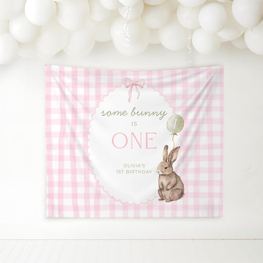 Some Bunny is One Birthday Backdrop Bunny Birthday Welcome Sign Pink Gingham Bunny Banner Personalized Easter Birthday Decoration