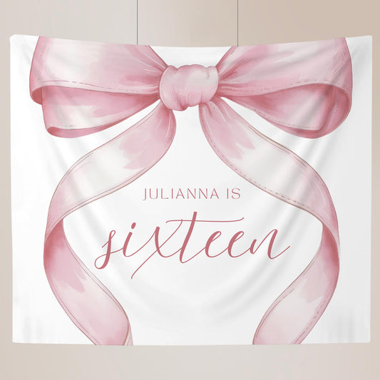 16th birthday Personalized Banner Coquette Party Decor Photo Backdrop 16th Birthday Sign sixteenth Pink Bow Birthday Sweet Sixteen