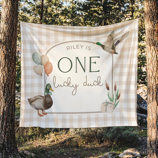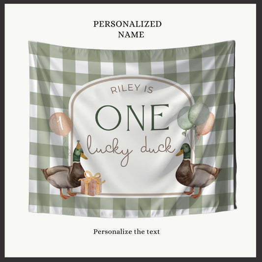 One Lucky Duck Birthday Personalized Banner 1st Birthday Lucky Duck Party Decor Photo Backdrop Duck Custom Banner First Birthday Ideas