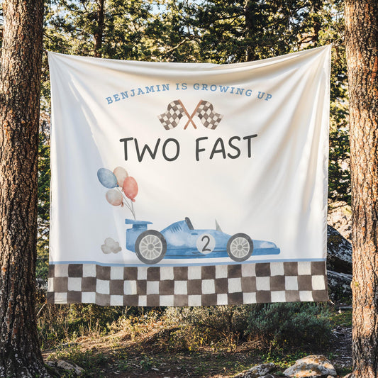 Two Fast Birthday Personalized Banner 2nd Birthday Racecar Party Decor Photo Backdrop Racing Custom Banner Two Fast Two Curious Wall Decor