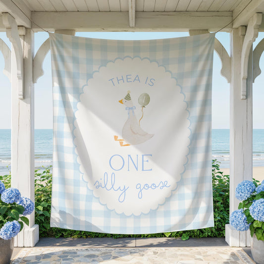Blue Gingham One Silly Goose Birthday Personalized Banner