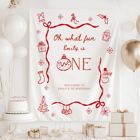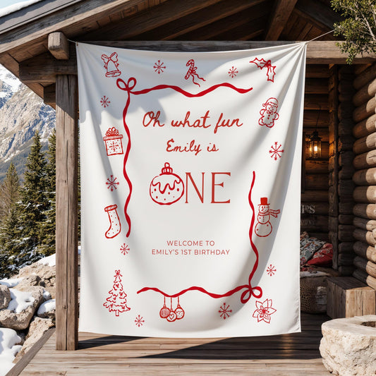 Christmas First Birthday Banner Oh What Fun it is to be One Welcome Sign Whimsical 1st Birthday Decor Coquette Bow Holiday Party Hand Drawn