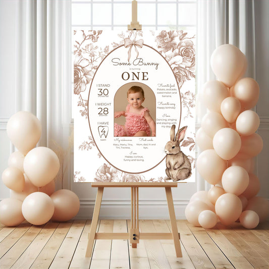 Some Bunny is One First Birthday Sign Stats Poster Editable Bunny 1st Birthday Monthly Banner Vintage Floral Rabbit Photo Milestone sign