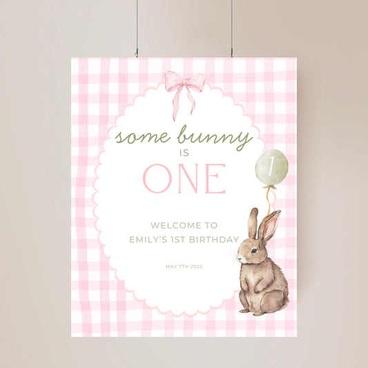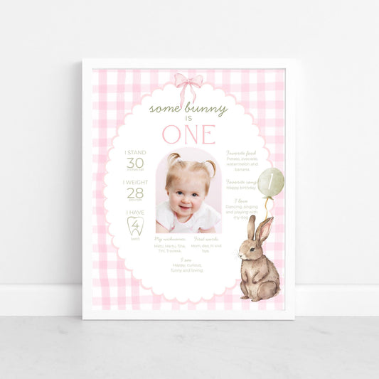 Some Bunny is One First Birthday Sign Stats Poster Editable Bunny 1st Birthday Monthly Banner Pink Gingham Rabbit Photo Milestone sign
