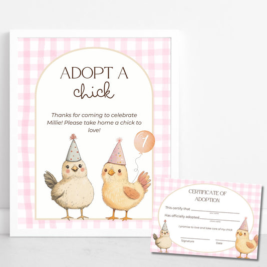 Adopt a Chick Sign Adoption Certificate One Cute Chick Party Favor Printable Birthday Decor Download Chicken Birthday Decor Barnyard