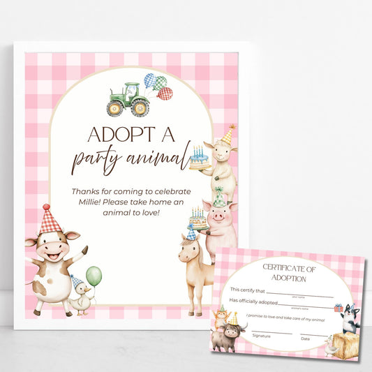 Adopt a Farm Animal Sign Adoption Certificate One Party Animal Party Favor Printable Birthday Decor Download Farm Birthday Pink Barnyard