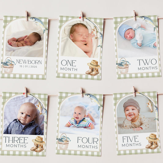 OFishally One Birthday Photo Milestone Banner Gingham Fishing 1st Birthday Bunting Banner Editable Template Monthly Milestone Photo Collage