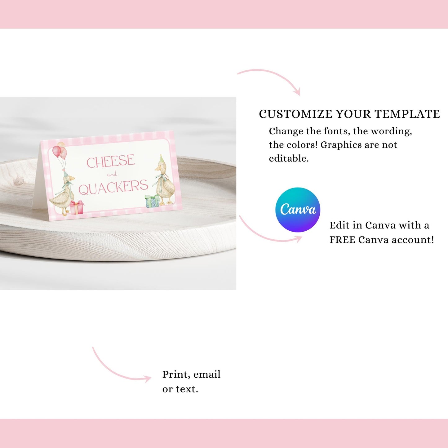 Celebrate your little one's special day with our delightful "One Silly Goose Birthday Buffet Cards." Perfect for a girls first birthday party, this editable template features a charming silly goose theme with pink gingham. Easy to customize with your details, this printable food label or place card can be designed using the user-friendly Canva template. Whether you're throwing a nursery rhyme birthday bash or a whimsical silly goose party, our instant download option allows you to get your table signs printed in no time.
